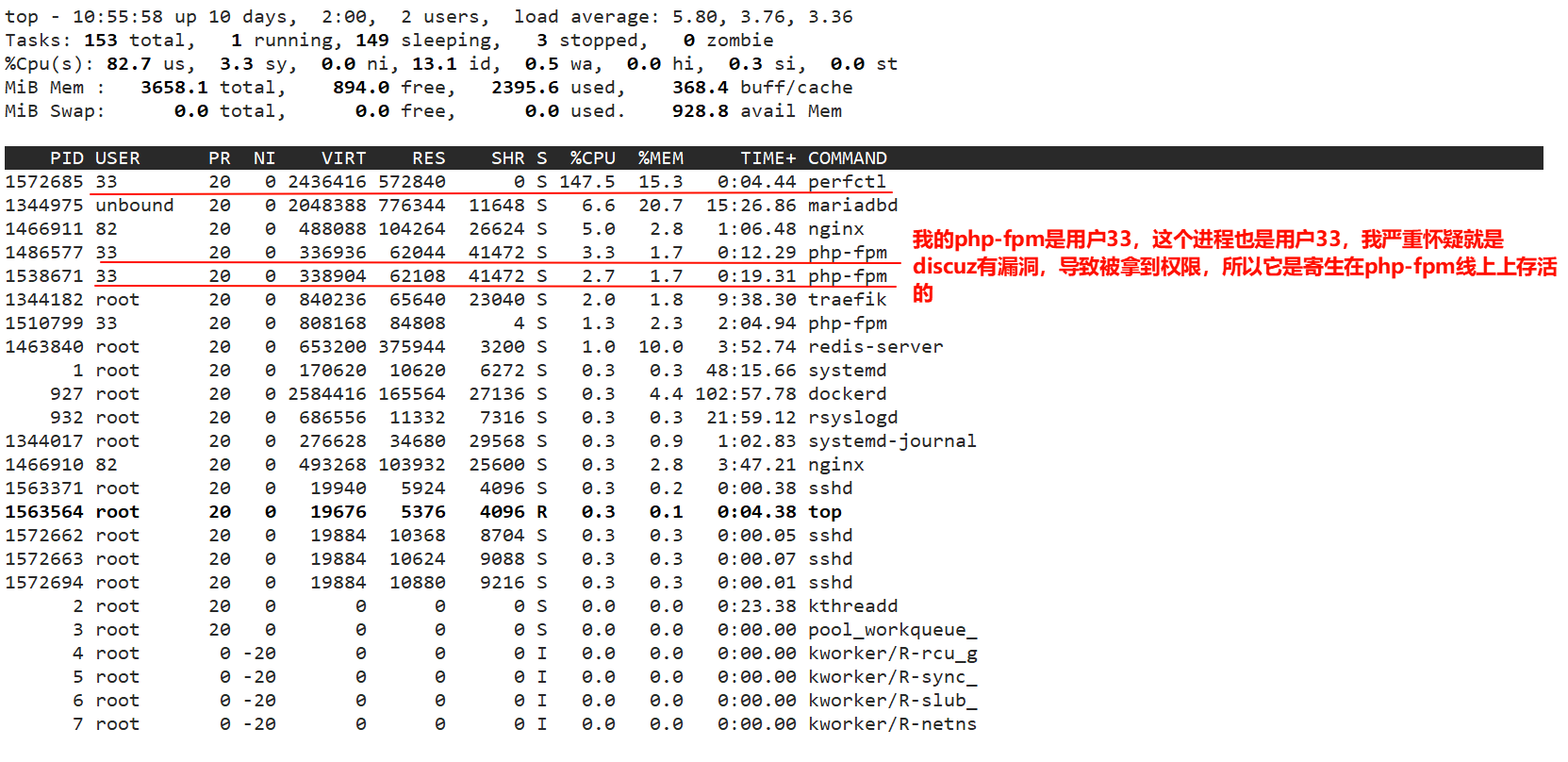 I was immediately aware that his way was definitely not for me, why? My thinking was that it was because of my last experience with the horse, I just stopped the redis service, there was no high cpu usage, and once I started it, it immediately spiked, so it must be the cause. And this time, I observe the uid of the running process, you see it, is 33, obviously, not run with root privileges, that it must be only when the mirror is running, only to go it to put the logic of the poison, so it must still be related to the mirror, I decisively stopped one of their own php services, and sure enough, perfctl disappeared from the occupancy charts.